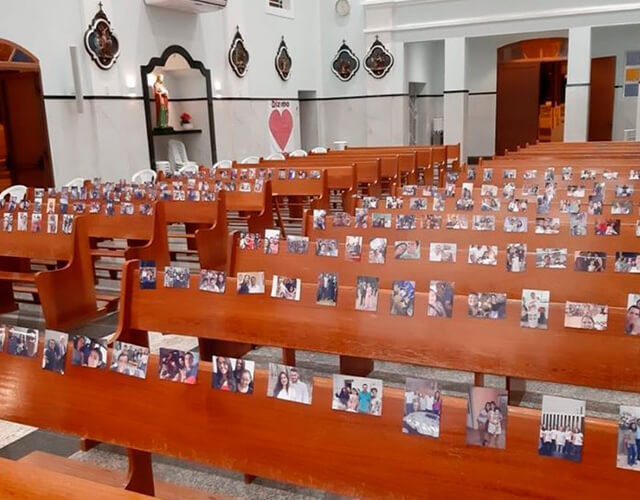 O grande exemplo do momento vem da cidade de Quintana, região de Marília. Padres celebram a missa online, no entanto, as cadeiras não estão mais vazias, fotos das famílias dos membros foram coladas nos bancos. A pastoral da comunicação informou que a ideia foi homenagear os padres e para que as famílias se sintam abraçadas.