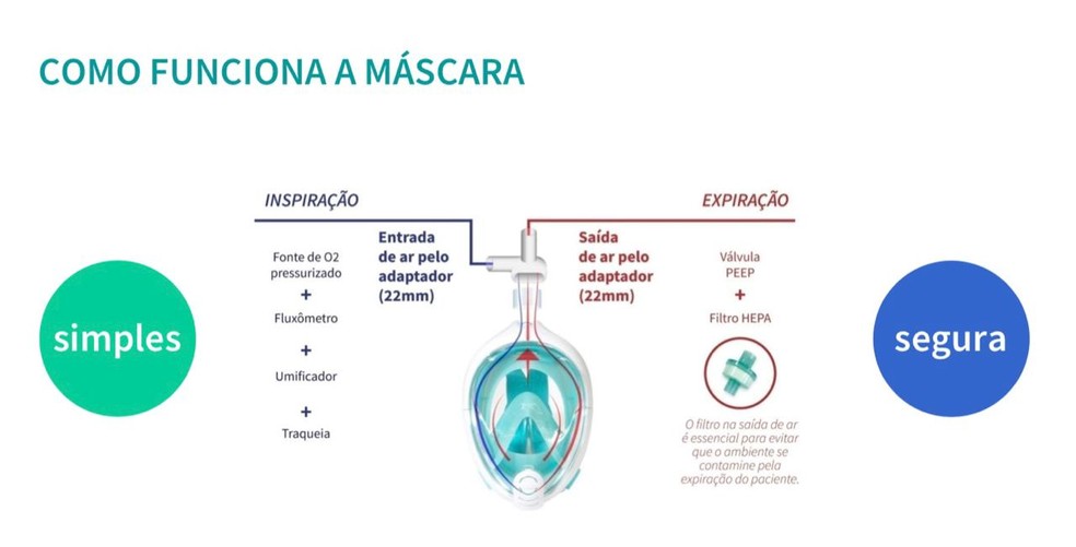 “O ar que a gente respira tem somente 21% de oxigênio. Então, quando a pessoa vai para intubação, pode receber uma adição maior, como 50%. Só que isso pode ser feito em ventilador pulmonar ou nessa máscara, com protocolo médico para saber quanto tempo a pessoa pode ficar, seguindo as recomendações médicas”, informa.
