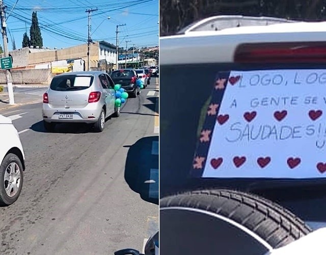 Com balões coloridos e cartazes nos carros, os professores de escolas e creche passaram pelas ruas distribuindo palavras de conforto: “Logo, logo a gente se vê”, “estamos com saudade de vocês, nossos alunos”, “nós te amamos” e “se cuidem”.