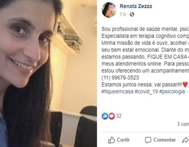 A psicóloga de Jundiaí, Renata Zezza, lançou uma campanha em tempos de pandemia do coronavírus: ela oferece atendimento gratuito para pessoas carentes.