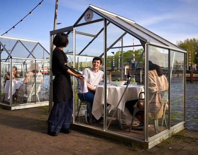 Para driblar a crise, um restaurante vegano de Amsterdã, na Holanda, resolveu reabrir o estabelecimento com mesas colocadas dentro de estufas.