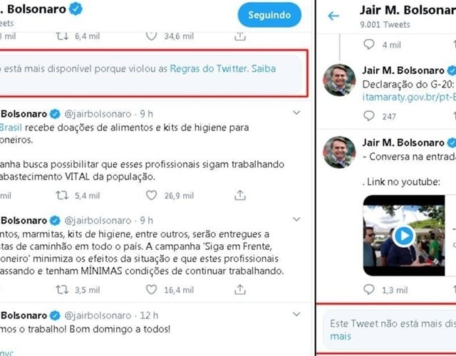 O Twitter apagou duas publicações da conta oficial do presidente Jair Bolsonaro na noite de domingo (29). No lugar das publicações aparece a mensagem: “Este tweet não está mais disponível porque violou as regras do Twitter”.