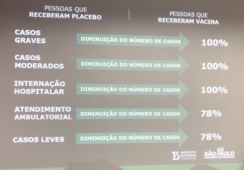 A informação foi apresentada para a Agência Nacional de Vigilância Sanitária (Anvisa) em reunião nesta manhã. A agência recomenda a taxa de eficácia mínima de 50%. Assim, o governo deve já solicitar o registro definitivo e o pedido para uso emergencial do imunizante.