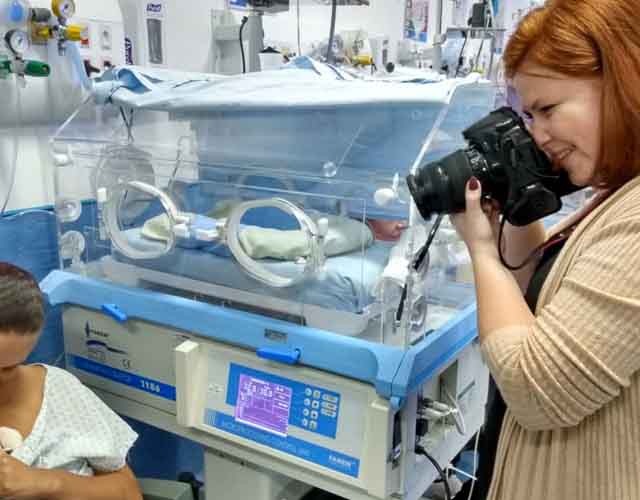 Na salinha, onde os pais e as mães aproveitam os momentos diários com os seus filhos enquanto não podem levá-los para casa, ela passa por cada um deles tirando as fotogrrafias.