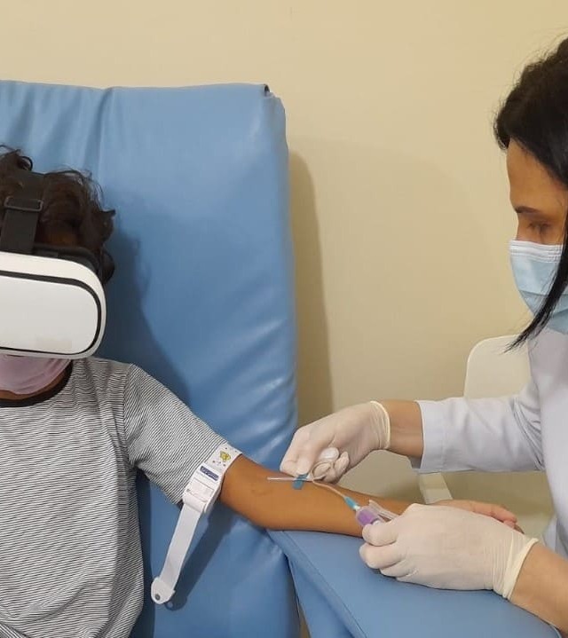 Outra novidade, que foi implantada no Hospital da Criança em dezembro de 2021, é os óculos de realidade virtual. Essa ferramenta é utilizada na coleta de sangue das crianças e é uma forma de distrair os pequenos pacientes durante a punção venosa – ou mesmo na punção digital, aquele da pontinha do dedo.