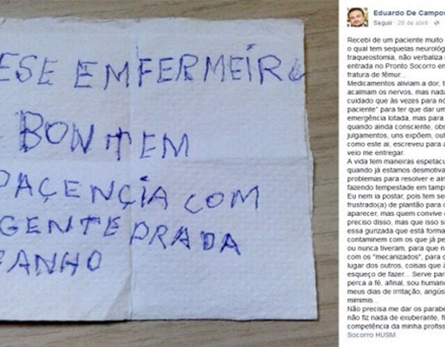 Na publicação, Eduardo explicou as motivações do procedimento: “Medicamentos aliviam a dor, tratam infecções, acalmam os nervos, mas nada supera o cuidado; o cuidado que às vezes para nós é como ‘só mais um paciente’ para ter que dar um banho numa emergência lotada, mas para quem o recebe, quando ainda consciente, observa tudo, faz julgamentos, uns expõem, outros comentam. E como este aí, escreveu para a sua esposa e ela veio me entregar”.