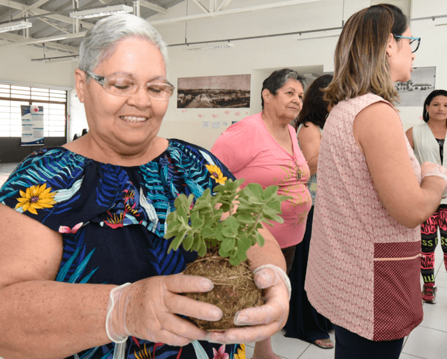 Ruth Gomes Lima, 64 anos, participa de todas as atividades oferecidas no CECCO, inclusive as oficinas de arteterapia. “Quando cheguei aqui, estava com vários problemas de saúde e as atividades, tanto de ginástica quanto lian gong e o grupo da dor, devolveram as minhas habilidades motoras. As oficinas são um complemento fantástico, já que conversamos, trocamos experiências e aprendemos cada vez mais”, explicou a mulher, que escolheu uma muda de boldo para montar o seu vaso vegetal.