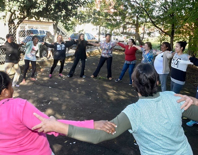Com experiência do grupo anterior, Roseli dos Reis Oliveira Santos, 46 anos, começou a participar da atividade para acompanhar um parente, encaminhado por indicação após sofrer acidente e lesionar os nervos do braço direito. “Eu também sentia dores nas costas e pernas. Com o grupo tudo melhorou. Até a autoestima, já que conversamos com mais pessoas, ouvimos as histórias e percebemos que existem outros problemas que são maiores que os nossos”, explica a mulher.