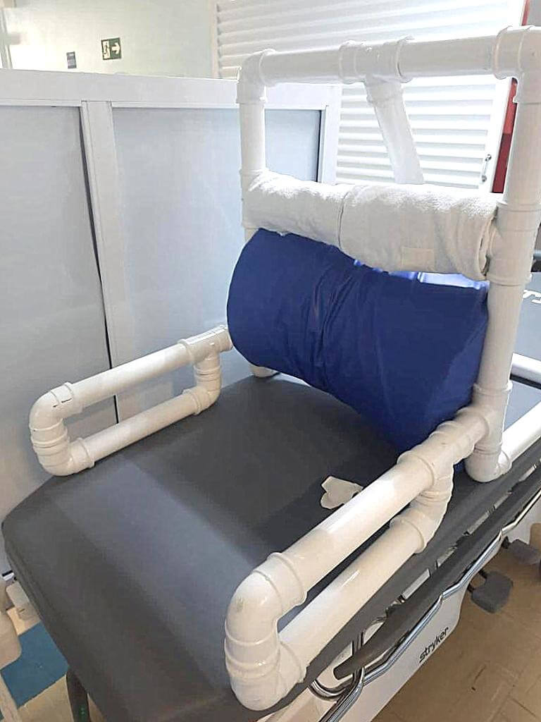 Foi por meio dessa ação de empatia, que o coordenador da fisioterapia do HSV, Daniel Gimenez Rocha, decidiu adotar o recurso. “Sem o equipamento, os pacientes precisam ser retirados do leito e sentados em uma poltrona, o que envolve mais riscos. Agora, com esse equipamento, o paciente fica com apoio lateral e nas costas, permitindo que um único profissional consiga sentar o paciente à beira do leito e ajudá-lo a fazer os exercícios recomendados para cada sessão de fisioterapia. O paciente acamado começa a perder a funcionalidade, força muscular e adquire vícios posturais. A cadeira é importante para a realização da fisioterapia respiratória e para a parte motora também”, explica.