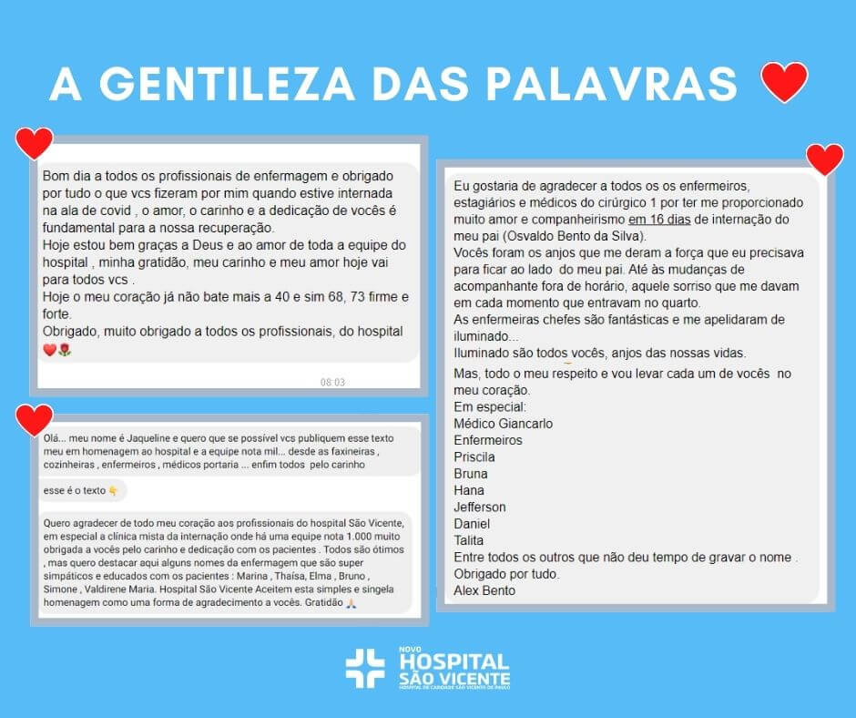 A Jaqueline Cristina da Silva aproveitou os recursos online para parabenizar o trabalho das equipes. “Gostaria de agradecer a todos os profissionais do São Vicente, a equipe da higiene, da cozinha, enfermeiros, médicos e controladores de acesso, pelo tratamento que recebi. Em especial, destaco a dedicação dos profissionais da clínica mista, que sempre foram extremamente simpáticos e educados”.