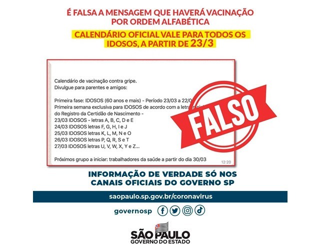 O Governo do Estado de São Paulo divulgou uma nota neste domingo (22) desmentindo a mensagem que haverá vacinação por ordem alfabética na segunda-feira (23).