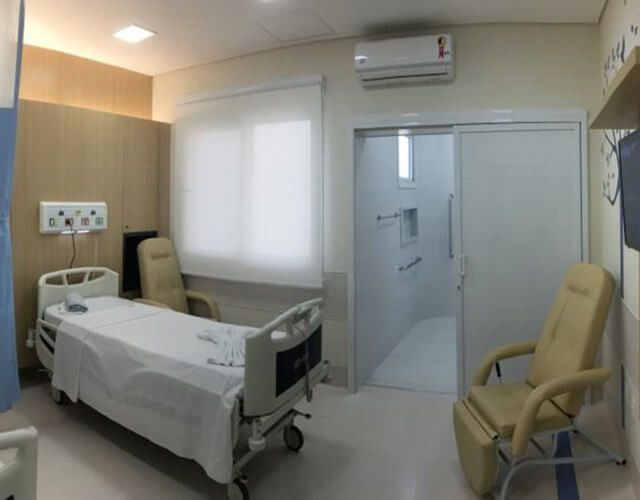 O espaço também recebeu painéis de madeira individualizada e o quarto foi equipado com TV, ar-condicionado e kit leito (cama elétrica, régua multifuncional, poltrona para acompanhante, divisória e bandeja).