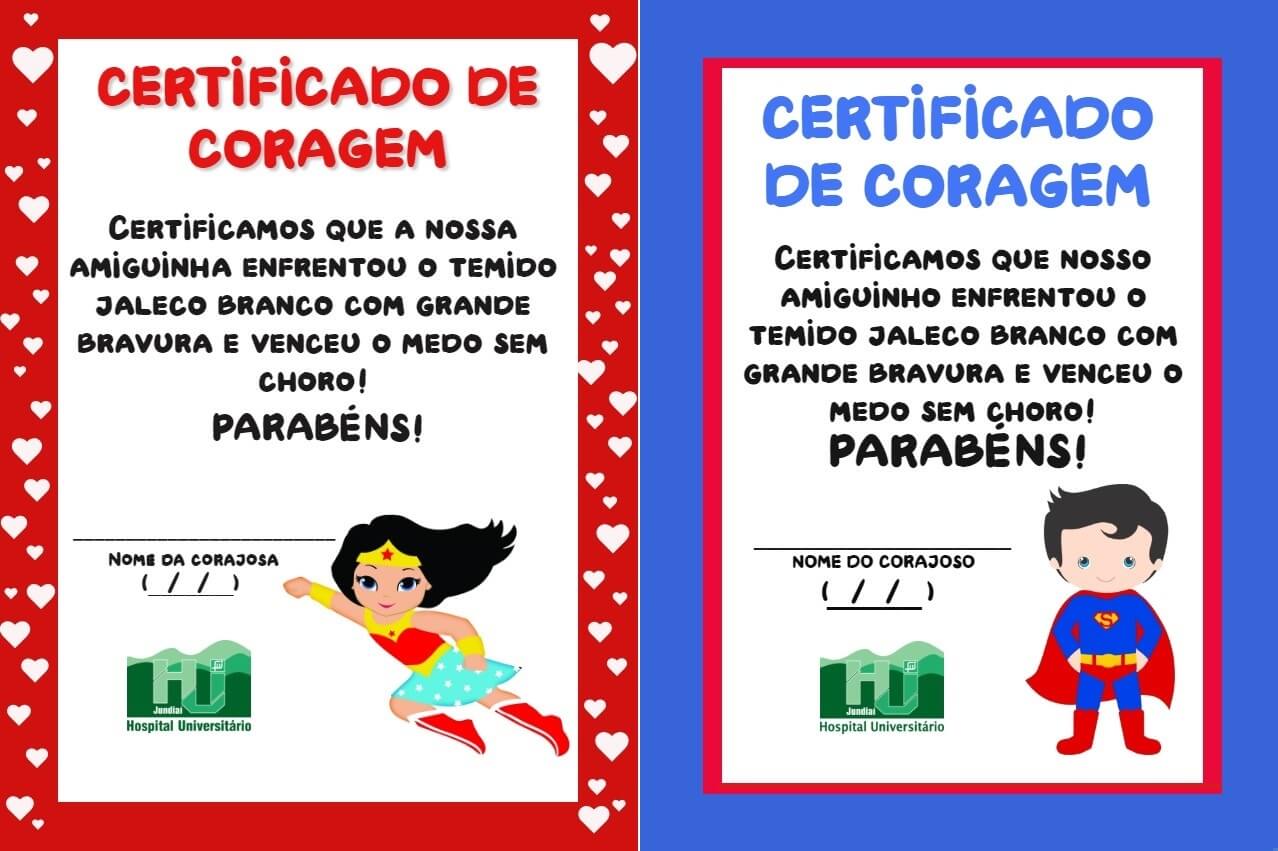 O certificado traz a seguinte frase “Certificamos que nosso amiguinho (a) enfrentou o temido jaleco branco com grande bravura e venceu o medo sem choro! Parabéns”, além do espaço para a assinatura e logo do hospital.