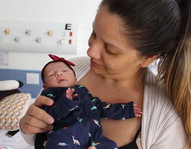 A pequena Elisa, de 1 mês e 3 dias, está na UTI durante todo esse período. Ela nasceu de 29 semanas e, desde então, a mãe, Jéssica Cipriano da Silva, também vai diariamente ao hospital, visitar a filha e pegá-la no colo, fortalecendo o vínculo entre mãe e filha.