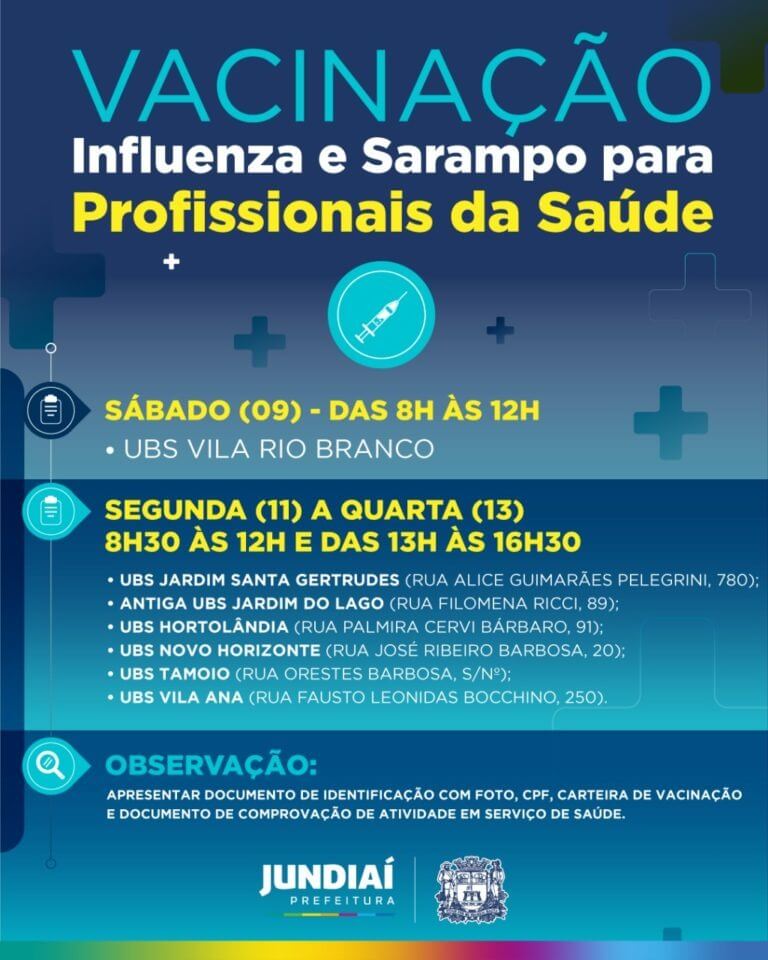 Neste sábado (9), a Prefeitura de Jundiaí promove a vacinação contra Influenza (gripe) e sarampo para profissionais dos serviços públicos e privados de Saúde. Além disso, alunos dos cursos das áreas de saúde que estão fazendo estágio também podem se imunizar contra a gripe nessa campanha.