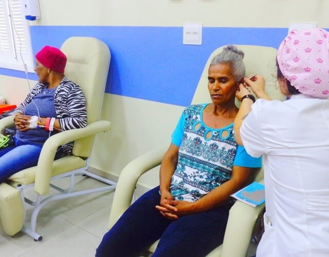 As profissionais aplicaram nas pacientes a técnica de acupuntura chamada auriculoterapia, que consiste na estimulação de pontos nas orelhas, onde todo o corpo é representado por um “mapa”.