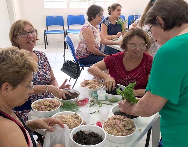 Além do preparo, outra atividade envolvendo os fitoterápicos e promovida na UBS Caxambu é a oficina de kokedama, tipo de cultivo ornamental que pode ser utilizado em pequenos espaços para a produção das próprias ervas e temperos.