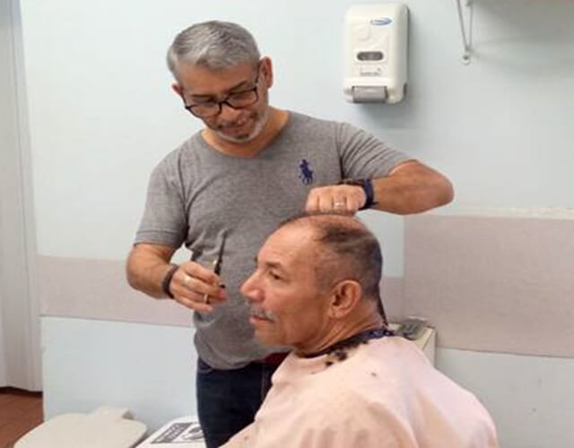 Os irmãos e voluntários Antônio Reinaldo de Lima e Leonardo Lima iniciaram na manhã desta segunda-feira (16), a primeira ação voluntária no Hospital São Vicente de Paulo (HSV). Eles cortaram o cabelo, fizeram a barba e contribuíram com autoestima dos pacientes internados na ala Masculina.